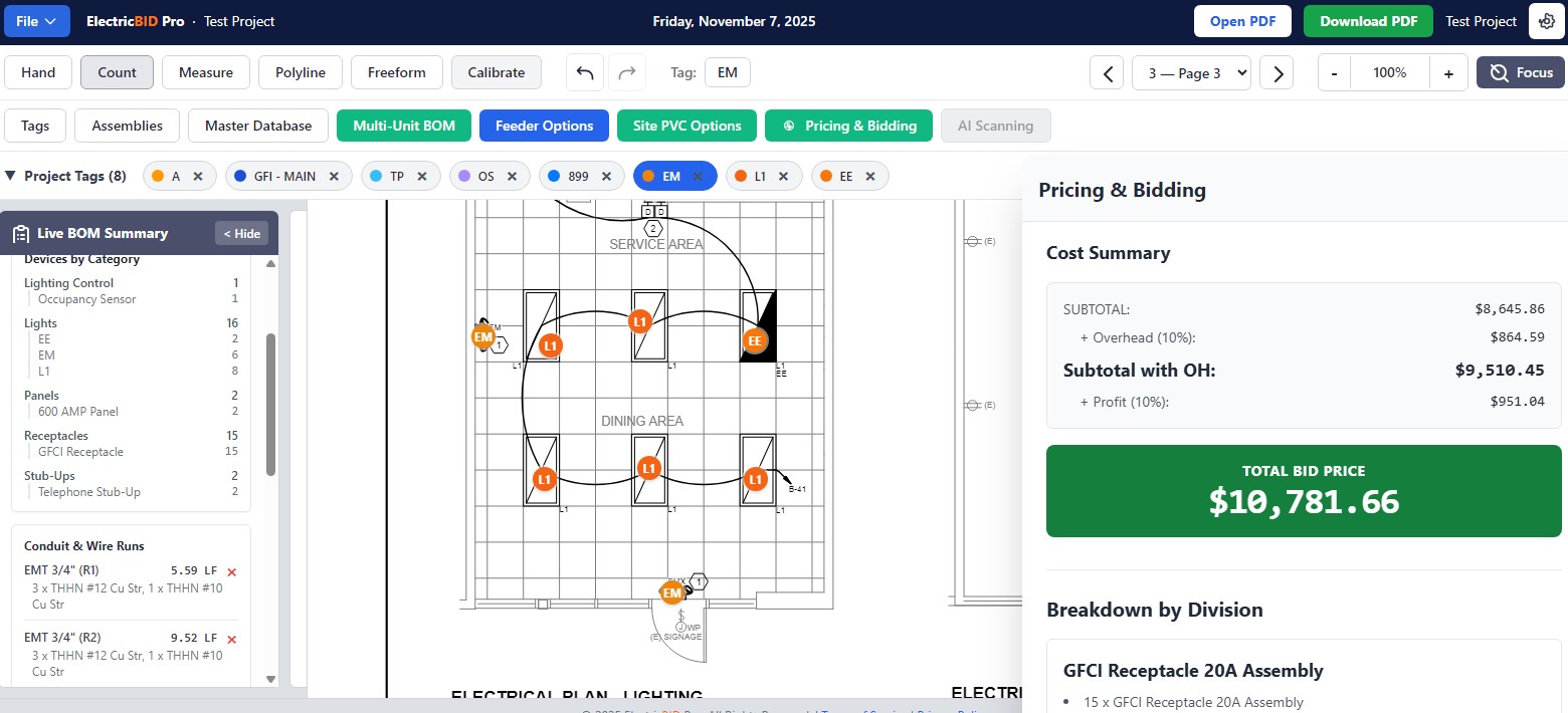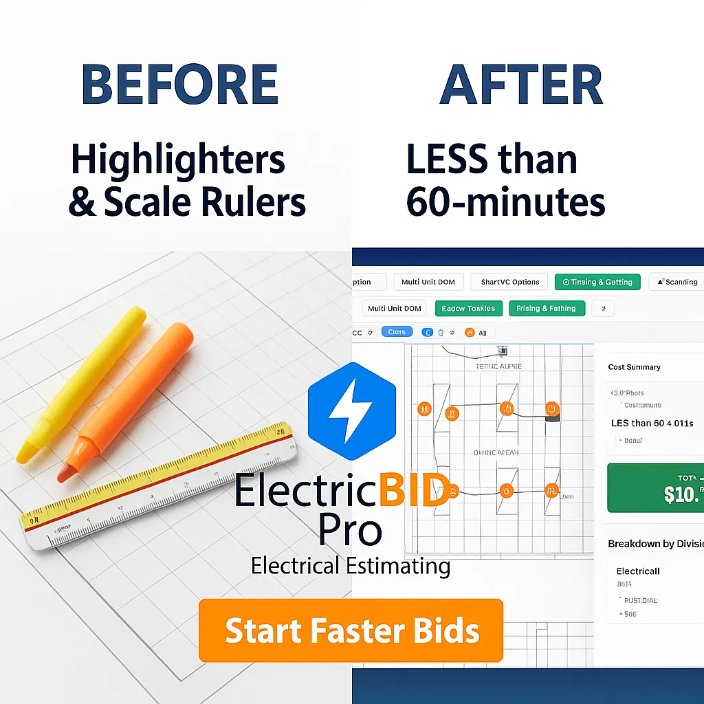 “I was skeptical about another subscription, but ElectricBID Pro pays for itself on the first small job. It's incredibly intuitive—I was doing my first real takeoff within an hour. It's saved me from countless late nights manually counting fixtures.”